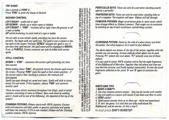 MAKE A MAP!!! 2. Use your stamina potions wisely – they can be carried until needed. 3. Any evil spells in a cavern will vanish if you leave and then re-enter it. VERY useful! 4. Spell names contain hints as to their use – think and experiment. 5. To ‘win’ the game, it is vital that you fully understand the Riddlescroll, and do and die (Is this a clue?). |